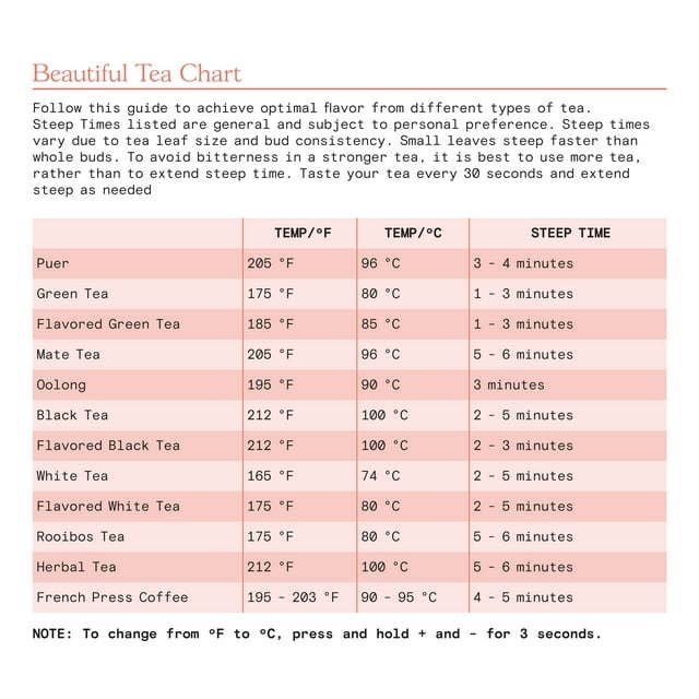 Product details Our signature touch-activated display illuminates only when you need it. No dials, buttons or knobs. Powerful 1500-watt system heats up quickly and boils 7 cups in under 7 minutes. 4 one-touch preset programs and adjustable temperature settings ensure ideal temperatures for all kinds of tea: White 165°F, Green 175°F, Oolong/Coffee 195°F, Black/Boil 212°F. Audible indicator beeps when water has reached temperature. Convenient 30-minute Keep Warm mode maintains water temperature. Crafted with double- wall stainless steel Cordless kettle separates from 360° power base for handling and serving. Auto shut-off and boil-dry protection enhance safety and ensure peace of mind.Color