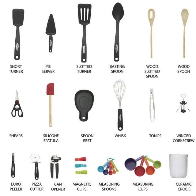 Product details Contains a complete assortment of essential kitchen cooking utensils and gadgets to build a well-equipped kitchen Ceramic crock keeps your kitchen tool set organized and within easy reach Includes stainless steel, nylon and wood tools and gadgets All items are dishwasher-safe with the exception of the can opener, wing corkscrew, bag clips, wood spoons, silicone spatula, shears, and crock, which should be hand-washed and dried immediately Kitchen utensil set comes with a lifetime, limited warranty against defects colors may vary in storeAssembled Product Weight