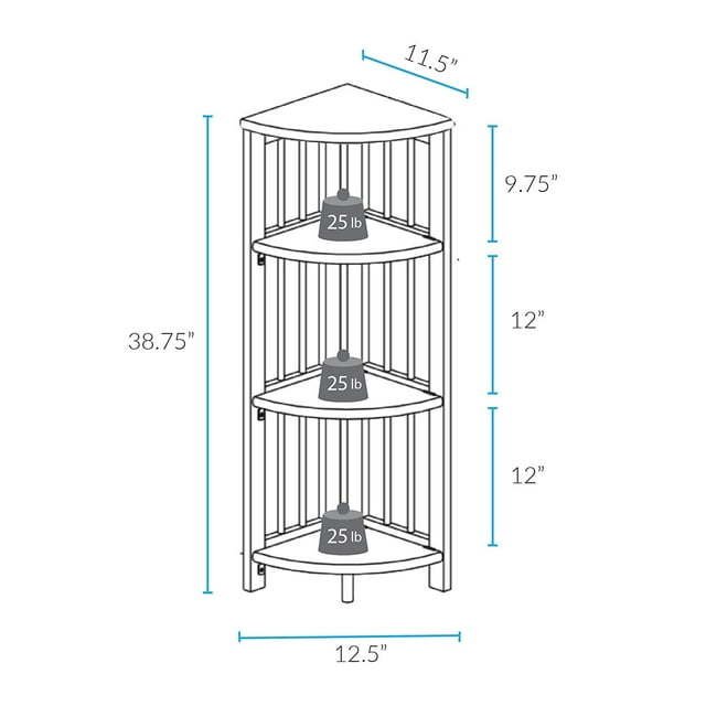 Product details 4 shelves to maximize storage and decorative displays. The foldable design makes for effortless transport and storage. Fits seamlessly in any corner to help utilize room space. 3 beam legs as well as a base leg stand firm to support your belongings. Solid wood construction for increased durability and longevity. No assembly is required.Assembled Product Weight