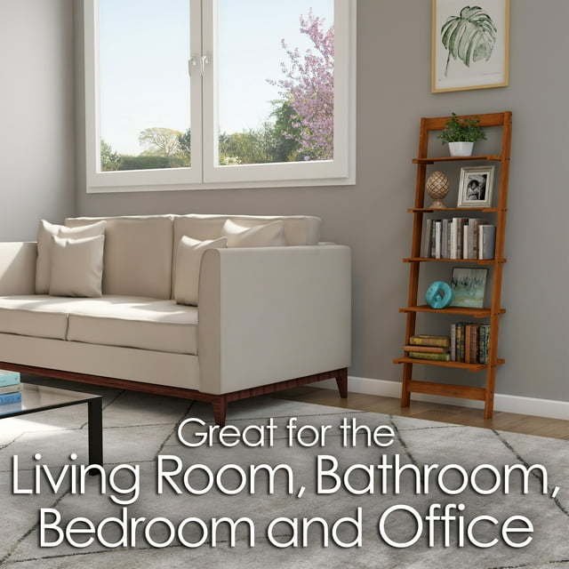 Product details COMPACT LADDER SHELF- Designed to attach to most walls, this ladder shelf has space-saving 15-inch display shelves that expand storage upward and spruce up small rooms. SPACIOUS VERTICAL STORAGE- Use the display shelf as a plant shelf in sunrooms, a bookshelf for bedrooms, a towel rack in the bathroom, or storage shelves for the kitchen or pantry. VERSATILE DECORATING- The simple design pairs well with modern farmhouse decor and traditional living room furniture alike, while the cherry finish meshes with numerous colors. STURDY WOOD SHELF- Rely on sturdy wood construction to make these bookshelves an enduring addition to your living room decor while remaining lightweight enough for easy movement. DIMENSIONS- (L) 11.5" x (W) 16.25" x (H) 50". Shelves: (W) 15" x (H) 8". COLOR- Cherry Wood Finish. Assembled Product Weight