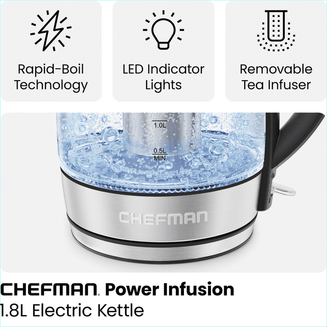 Product details RAPID-BOIL TECHNOLOGY: Boil water faster than microwave or stovetop methods so you can spend less time waiting and more time sipping. LED INDICATOR LIGHTS: The kettle lights up with blue LED lights while the water is boiling and shuts off when your water is ready. VERSATILE TEA MAKING: Removable stainless steel tea infuser allows you to brew your favorite loose-leaf or bagged teas directly in the stain-resistant borosilicate glass kettle. CORDLESS POURING: The kettle easily lifts from its 360° swivel base for easy serving and filling without the hassle of a power cord. SAFER BOILING: Auto-shutoff and boil-dry protection allow you to walk away while your water boils and puts your mind at ease.Assembled Product Dimensions (L x W x H)