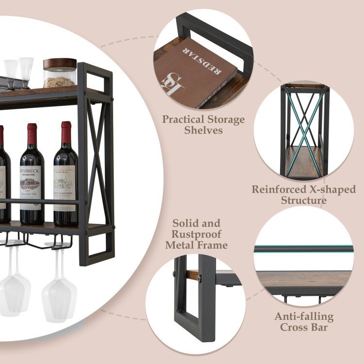Industrial Wall Mounted Wine Rack with 3 Stem Glass Holders