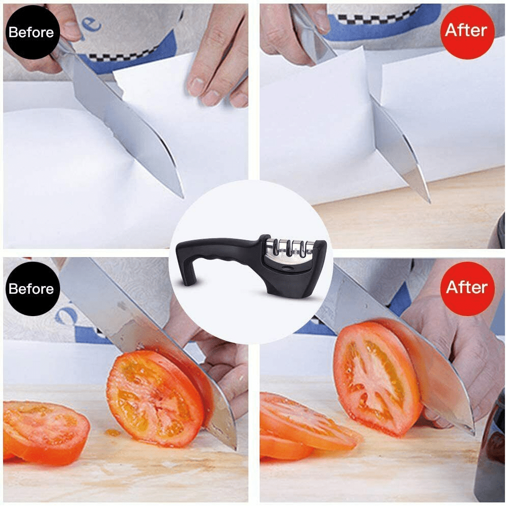 Professional Knife Sharpener by KT DealsFeatures The 3-Step Knife Sharpening kits are designed to sharpen any dull or damaged knives and blades. Stage 1: diamond sharpening rod repairs and straightens damaged blades. Stage 2: slot sharpens to restore its V-shape. stage 3 slot fine tunes for a final best polish. How Our Knife Sharpener Works: Stage 1 - Preparation (High grade Diamond rods). This 'roughens' the knife edge to prepare the surface for sharpening. It also smoothes any nicks and imperfections that could cause the blade to 'catch' during the sharpening stage (a common problem with 1 and 2 stage pull through sharpening slots which can cause damage to blades). Stage 2 - Sharpening (Hardened Tungsten Carbide Plates) - Now pull the blade through slot 2's precision angled tungsten carbide plates to create the perfect sharpened 'V' edge on even the bluntest knife. Stage 3 - Hone (Ceramic Stone Rods) - For final edge honing. It removes any burs and gently polishes the blade edges for a super sharp polish.