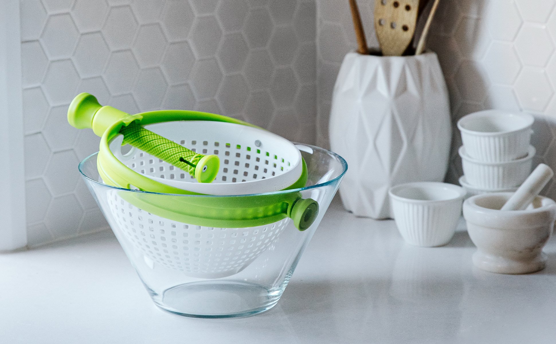 A COLANDER WITH A TWIST | Use to drain your pasta and rinse your veggies, or twist it into a spinner! No more shaking or drip-drying your salad leaves, the pump-action handle rotates the spinning colander, drying your produce in seconds.