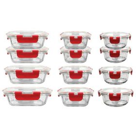 24-Piece Glass Food Storage Set with Locking Hinge Red Lids - Superior Quality
