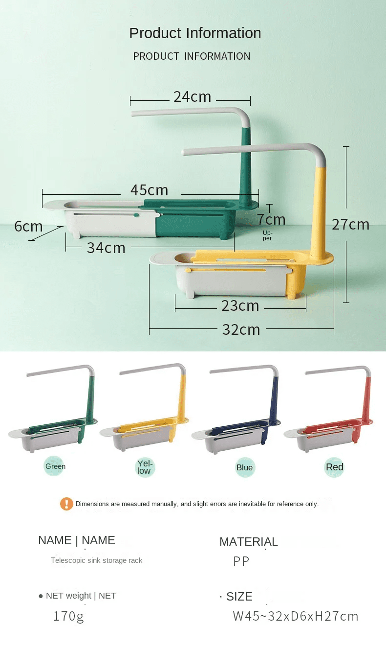 Adjustable Sink Caddy — Designed with an extendable telescopic design, this telescopic sink storage rack offers customizable sizing, accommodating various sink dimensions. Easily adjust its length (between 10.7 in/27.3 cm and 15.6 in/39.5 cm) for large-capacity storage. Perfect for most stainless-steel sinks, ensure compatibility with your sink size before purchase.