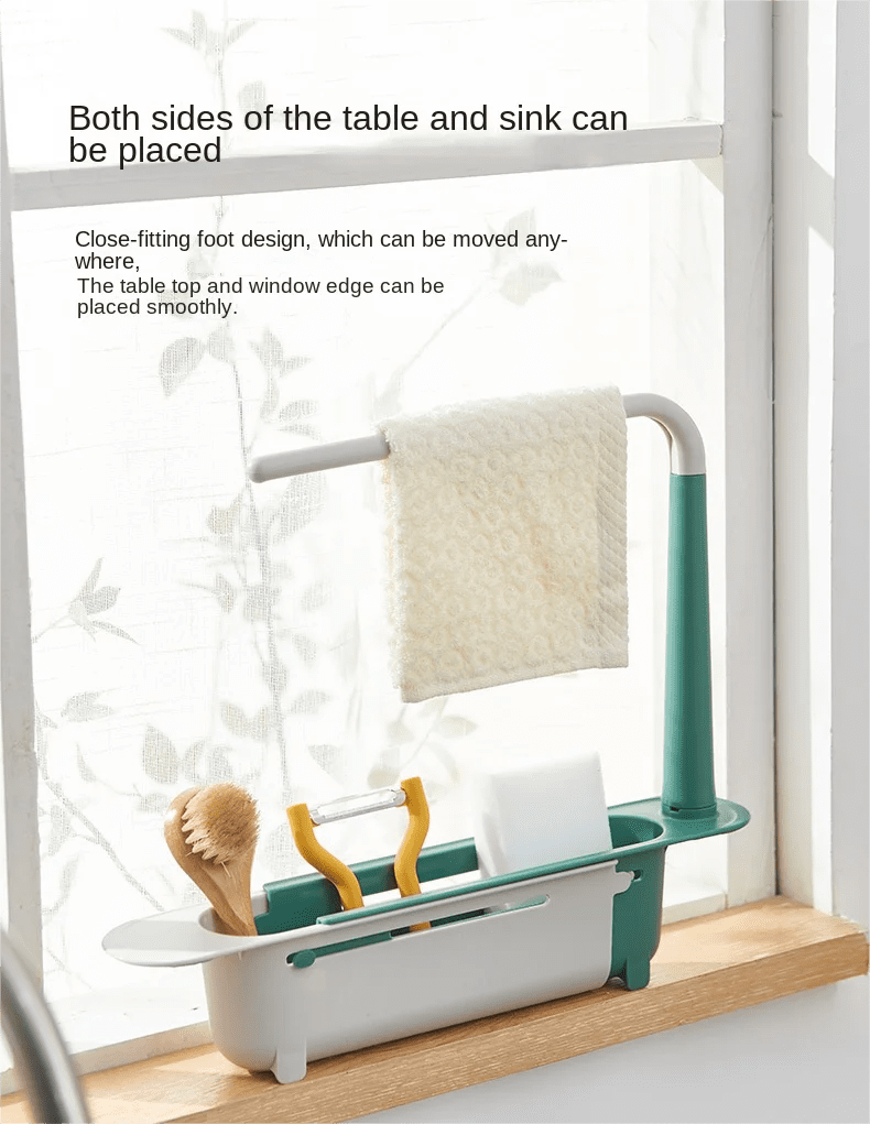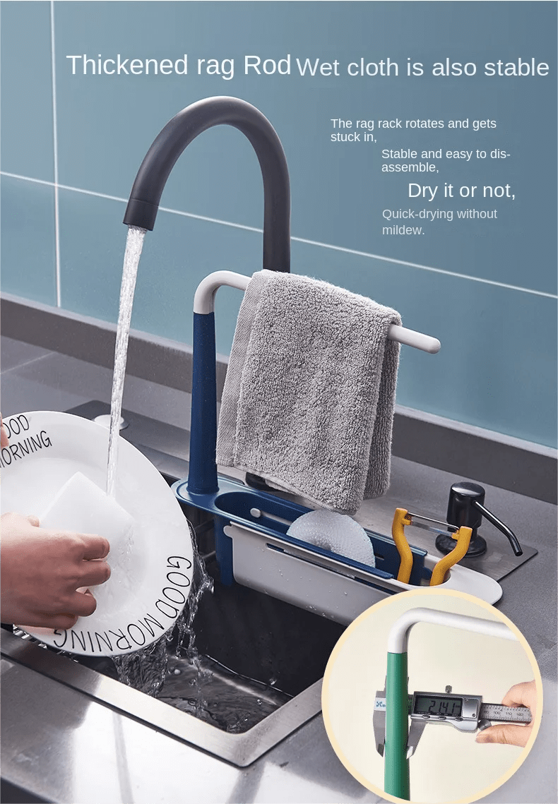 Removable Towel Holder — The sink sponge holder organizer features a detachable towel hanging bar, effortlessly install and remove. Telescopic sink storage rack adjustable is sleek design provides a tidy space to air-dry towels, keeping damp cloths hygienic. Wash it under the faucet with ease, draining excess water directly into the sink, ideal for limited counter spaces
