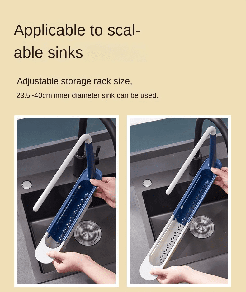 Adjustable Sink Caddy — Designed with an extendable telescopic design, this telescopic sink storage rack offers customizable sizing, accommodating various sink dimensions. Easily adjust its length (between 10.7 in/27.3 cm and 15.6 in/39.5 cm) for large-capacity storage. Perfect for most stainless-steel sinks, ensure compatibility with your sink size before purchase.