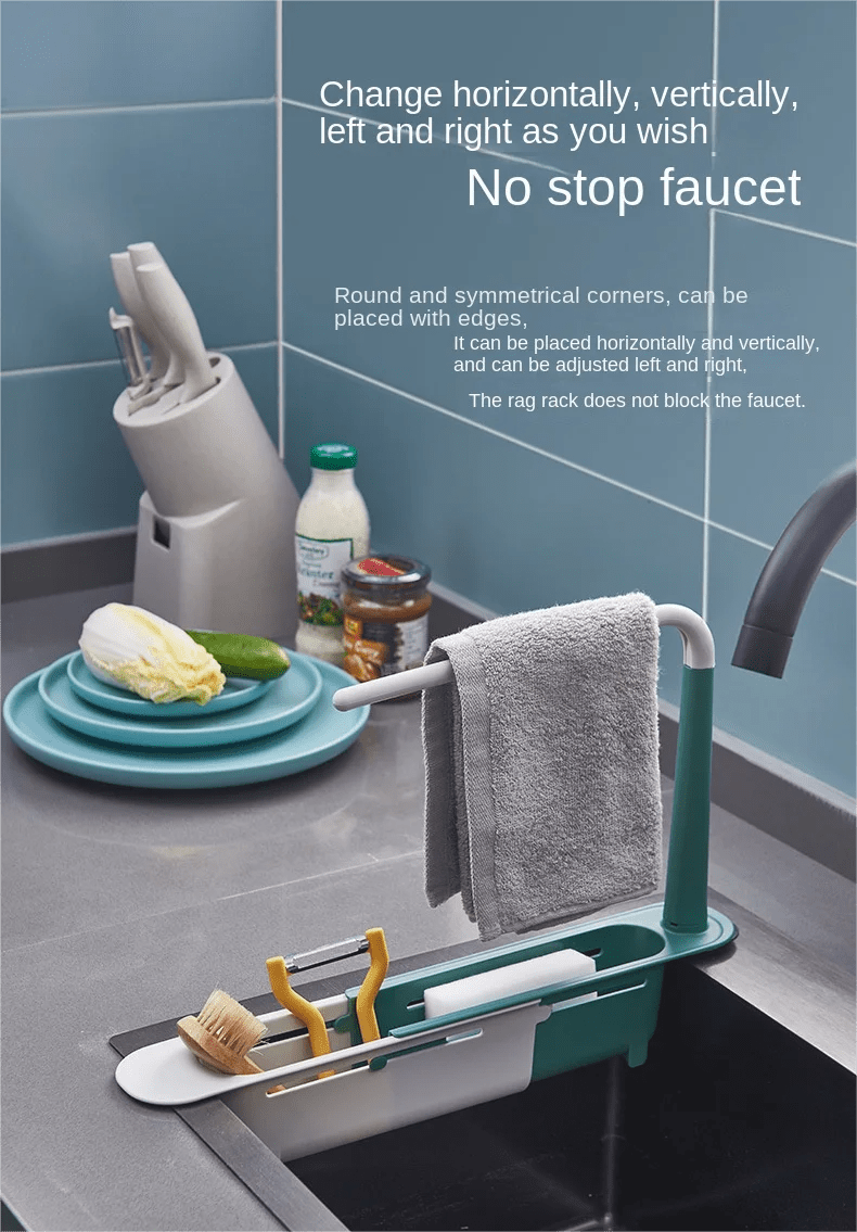 Removable Towel Holder — The sink sponge holder organizer features a detachable towel hanging bar, effortlessly install and remove. Telescopic sink storage rack adjustable is sleek design provides a tidy space to air-dry towels, keeping damp cloths hygienic. Wash it under the faucet with ease, draining excess water directly into the sink, ideal for limited counter spaces